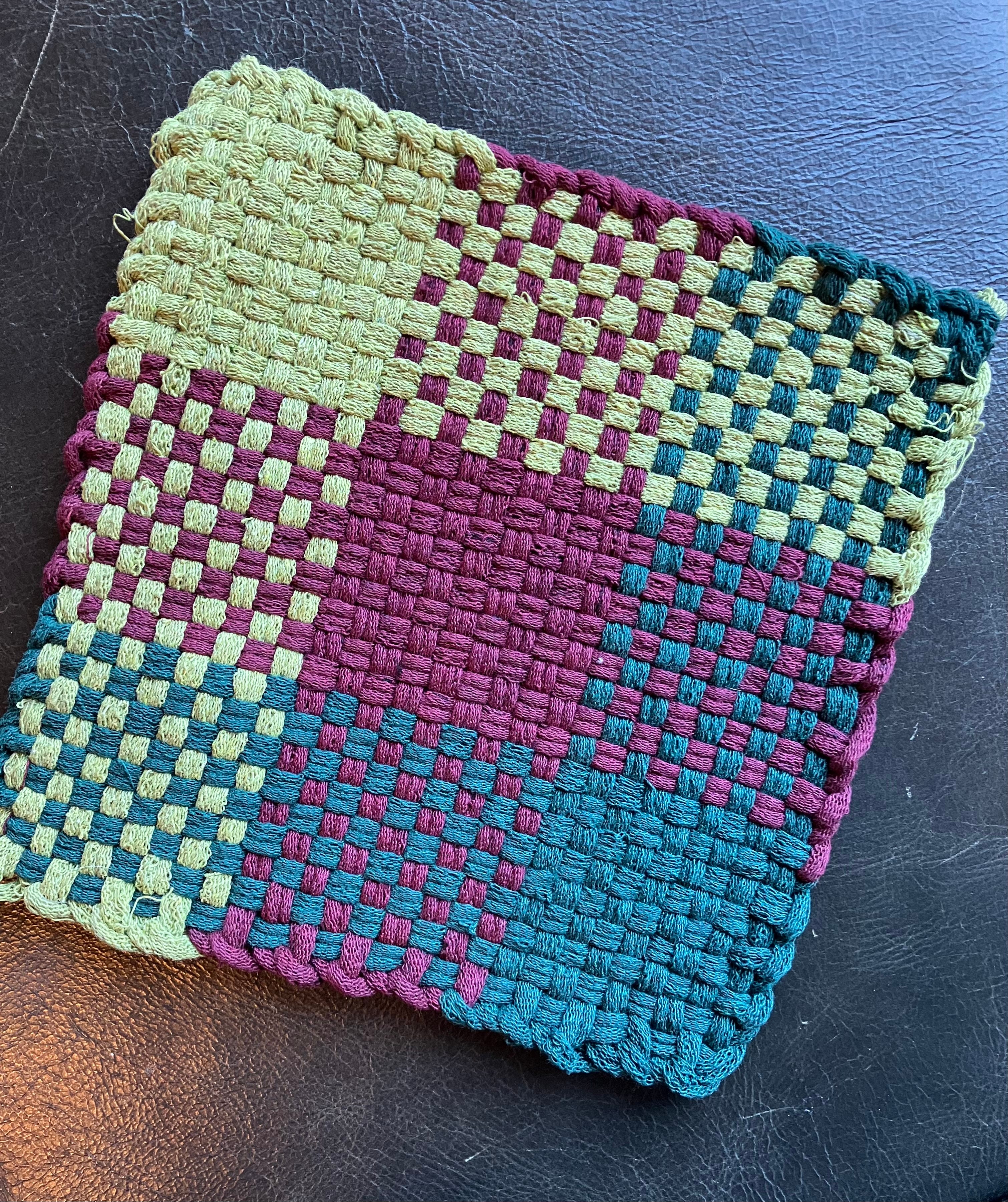 It is pleasantly tactile, hefty. It’ll make a good trivet. I recommend this hobby for anyone who likes to work with their hands but needs something fairly mindless and quick. The only drawback is that there are only a few makers of potholder loops and so a limited range of colors to choose from. If you’re into potholders, please leave a comment below, particularly if you know of sources for bespoke loops.